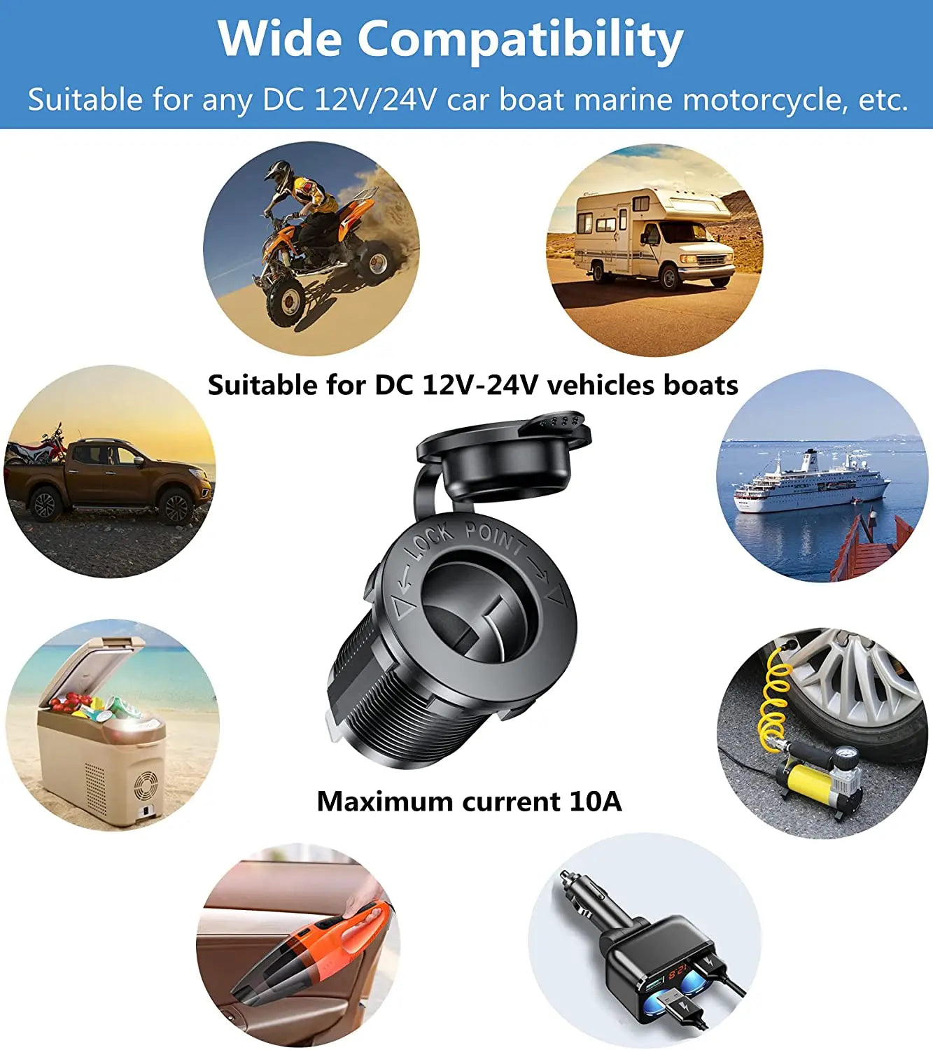 【MATERIAL】12V Cigarette Lighter Socket made of environment-friendly ABC material, high temperature resistant, low temperature resistant, also has anti-flame-retardant properties. It can work in an environment of -40° to 80°