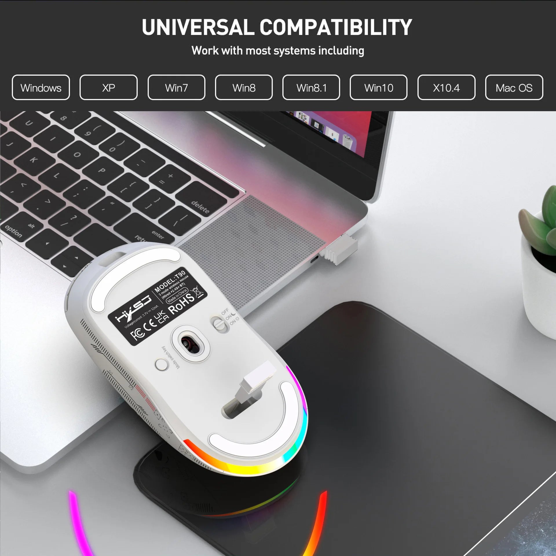 Product Parameters:Brand/Model: HXSJ/T90IC: PixArt 3212Rate of return: 125HZMovement speed: 30IPSRefresh rate: 4800FPSAcceleration: 10GOperation Mode: Opto-electronicType: 2.4 GHz/BT1/BT2Power Type : RechargeableNumber of keys : 6 keysKey life : 10 million switchesLight type : 12 Lighting ModesWireless distance : 10mBattery capacity : 750mAhDPI : 800-1200-1600-2400-3600Rated voltage / current : 3.7V / 15mAProduct weight : 101gProduct size : 12.8 * 6.3 *4cmPackage weight :142gPackage size : 13.5*8.5*4.7 cmPackage includes :1 x 2.4G/BT1/BT2 Wireless Mouse1 x USB Receiver1 x Type-C Charge Cable(80CM)1 x Instruction manualApplicable system:In BT mode :Windows ( windows XP / Vista / 7 / 8 / Server 2003 / 2000 / Win10 ,etc) Android (Android4.3 above)Mac OS (mac OS 10.10 above is recommended).In 2.4G mode:suitable for desktop computers, notebook computers, smart TV with USB interface, etc.Sleep mode:1: After the mouse is stationary, it immediately goes to shallow sleep.2: After 1.5 minutes of mouse rest, enter intermediate sleep and turn off RGB lights,3: Pause the mouse for 10 minutes to enter deep sleep.HOW TO USE:USB 2.4G mode connection steps:1. Set the mouse switch to ON .2. Plug the receiver into the computer's USB port. Press the mode button once.The red LED flashes and the installation is done automatically.BT Mode:To turn on the BT mode, you need to press the mode button for 3 seconds and the green light flashes quickly,indicating that the Bluetooth mode is activated and you can search for connections.BT Mouse1 mode connection steps:1. Turn on the BT icon on your computer.2. Turn on the mouse power switch, press the mode switch 2times, the second mode light turns green and flashes quickly.3. Enter BT Mouse 1 BT Wireless connection mode for pairing.BT Mouse 2 mode connection steps:1. Turn on the BT icon on your computer.2. Turn on the mouse power switch, Press the mode switch 3 times, the third mode light turns blue Flashing quickly.3. Enter BT Mouse 2 Wireless connection mode to select pairing.