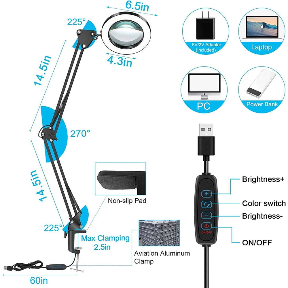 Adjustable Illumination & 3 Color Modes: This led illuminated magnifier is designed with 3 color modes to provide more lighting options, cool white, warm white, and natural white. The brightness can be changed between 10% and 100%. Choose the most suitable light source according to the desired environment. Perfect lighting for sewing, needlework, cross-stitching, coloring, puzzles, modeling, sculpting, drawing,sketching ,crafting ,manicures, repairing ,beauty and other hobbies