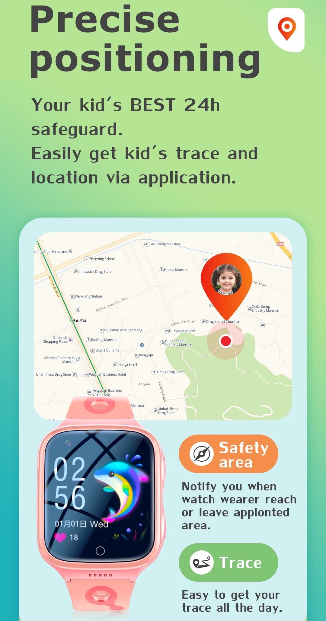 9. Class Monitoring Mode ,Safety Zone ,following, gallery, phone book, intercom,historic trajactory, Watchalarm clock, GEO Fence SOS emergency alarm, lowpower alarm, remoteshutdown, lighting, game,camera.