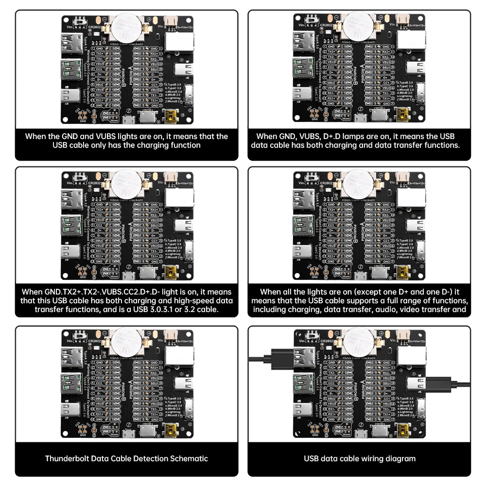 6.Measurement types: Typeb 3.0, typeb 2.0, typec 3.0/3.1/3.2, microb 3.0, microb 2.0, minib 2.0, and lightning.