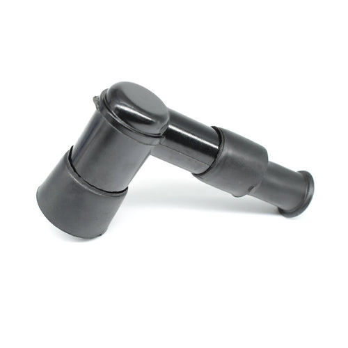 90 degree resin construction, with internal 5K Ohm resistor, for 14mm spark plugs (non threaded / FIXED spark plug top). The resin construction is designed to with stand heat and high tension. Both ends have rubber fittings to prevent moisture entering causing electrical leakage. Connected to the high-tension connection (HT lead) by a threaded internal cable connector.