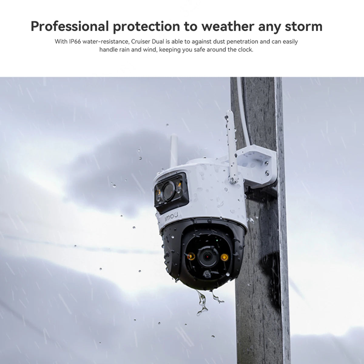 With IP66 water-resistance, Cruiser Dual is able to against dust penetration and can easily handle rain and wind, keeping you safe around the clock.Put your camera further with Wi-Fi 6