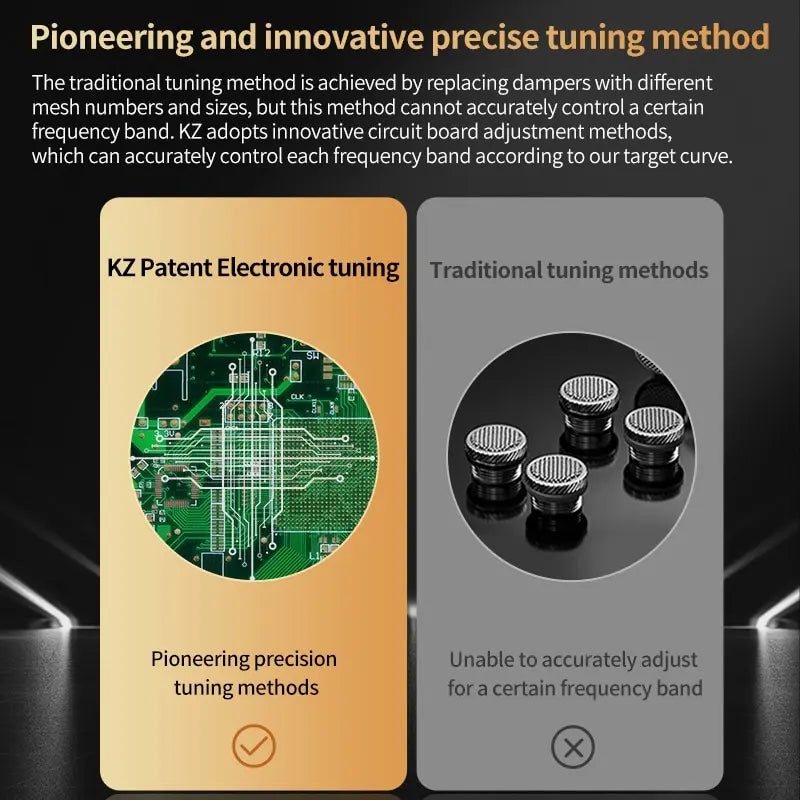 The traditional tuning method is achieved by replacing dampers with different mesh numbers and sizes, but this method cannot accurately control a certain frequency band. KZ adopts innovative circuit board adjustment methods, which can accurately control each frequency band according to our target curve.