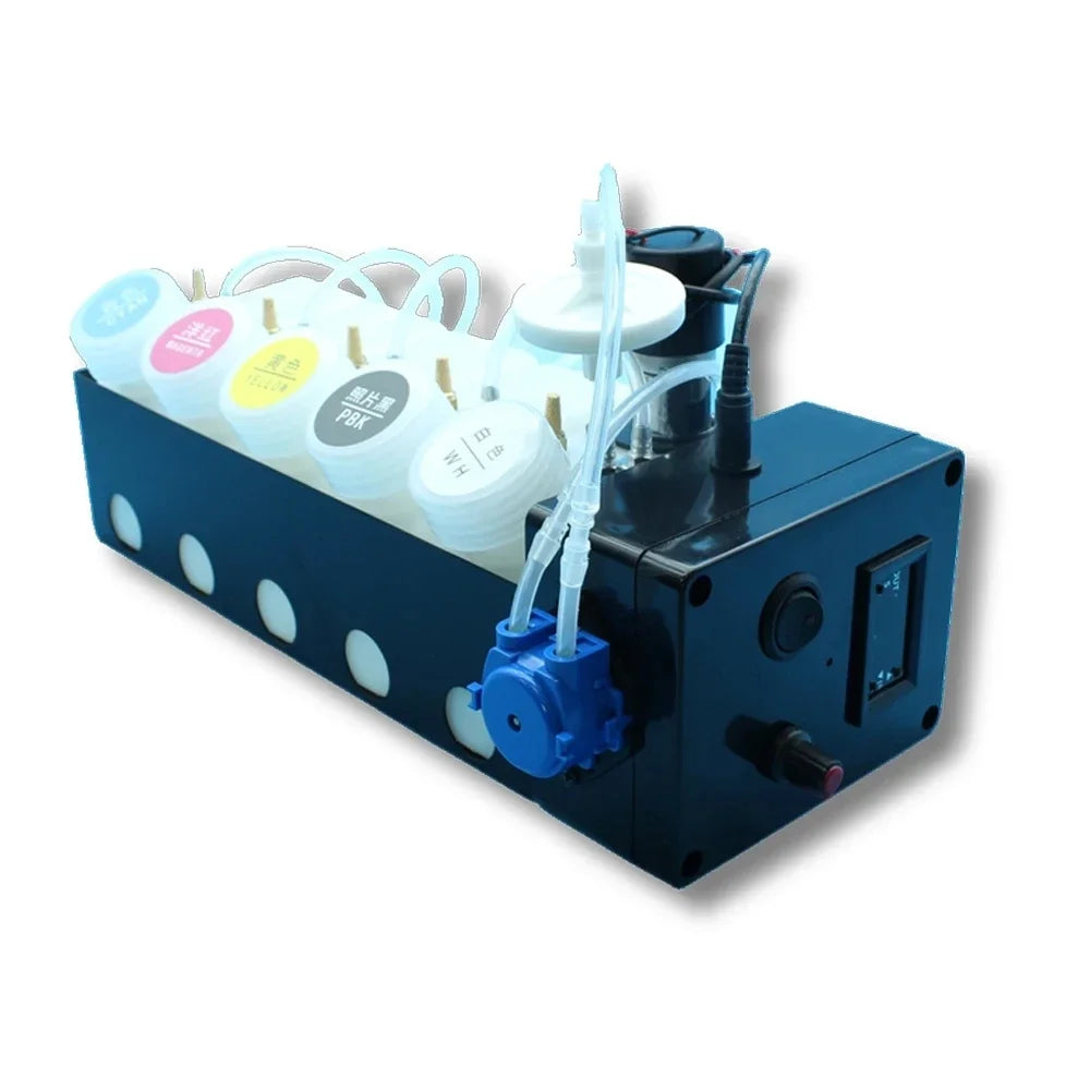 3. Functions: Air Filter for all 5 tanks. White Ink tank has stirrer with timer controlled. Pumping Circulation Adjustable