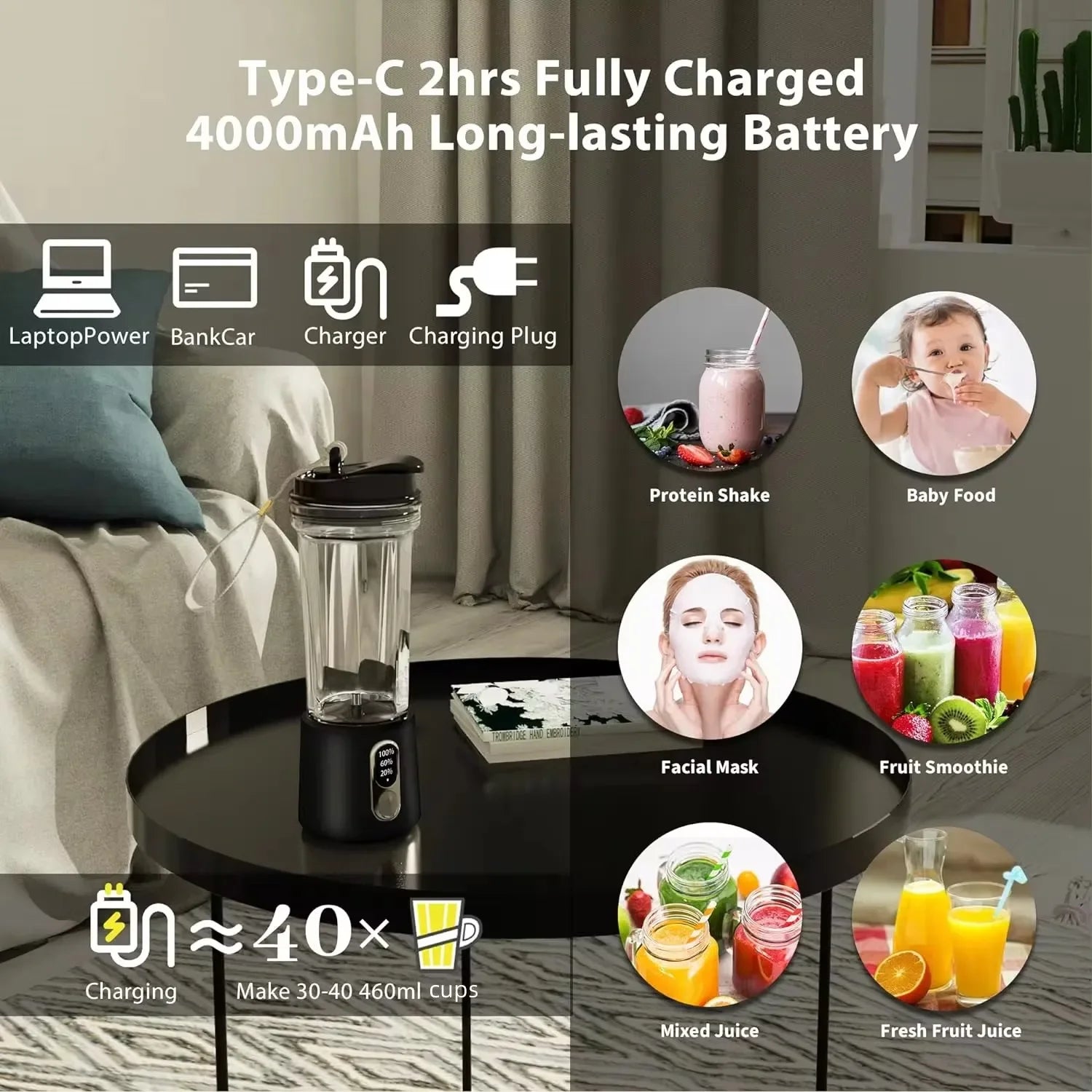 4000mAh Effortlessly charge the portable blender for just 2-3 hours and enjoy up to 30 cups of fresh juice. Simply connect it to any USB port, whether it's a power bank, laptop, car charger, or USB charger.