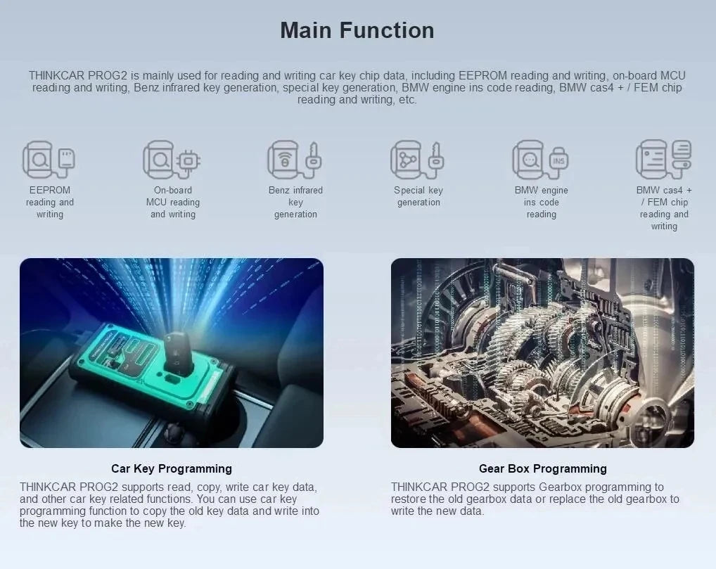 Main Function:THINKCAR PROG2 is mainly used for reading and writing car key chip data, including EEPROM reading and writing, on-board MCU reading and writing, Benz infrared key generation, special key generation, BMW engine ins code reading, BMW cas4 + / FEM chip reading and writing, etc.