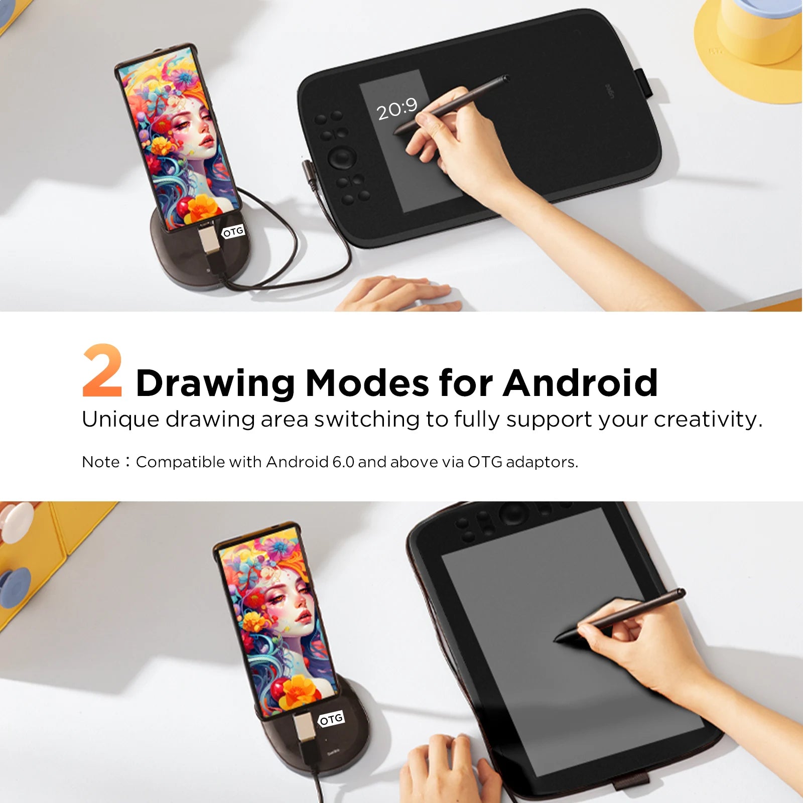 The drawing tablets features a mainstream Type-C port, With just one USB-A to C cable, you can effortlessly connect the digital drawing tablet to your computer, laptop, Android phone and tablet. When connected to an Android device, the M908 provides two different working area options. This caters to the diverse drawing preferences of creators on Android devices.