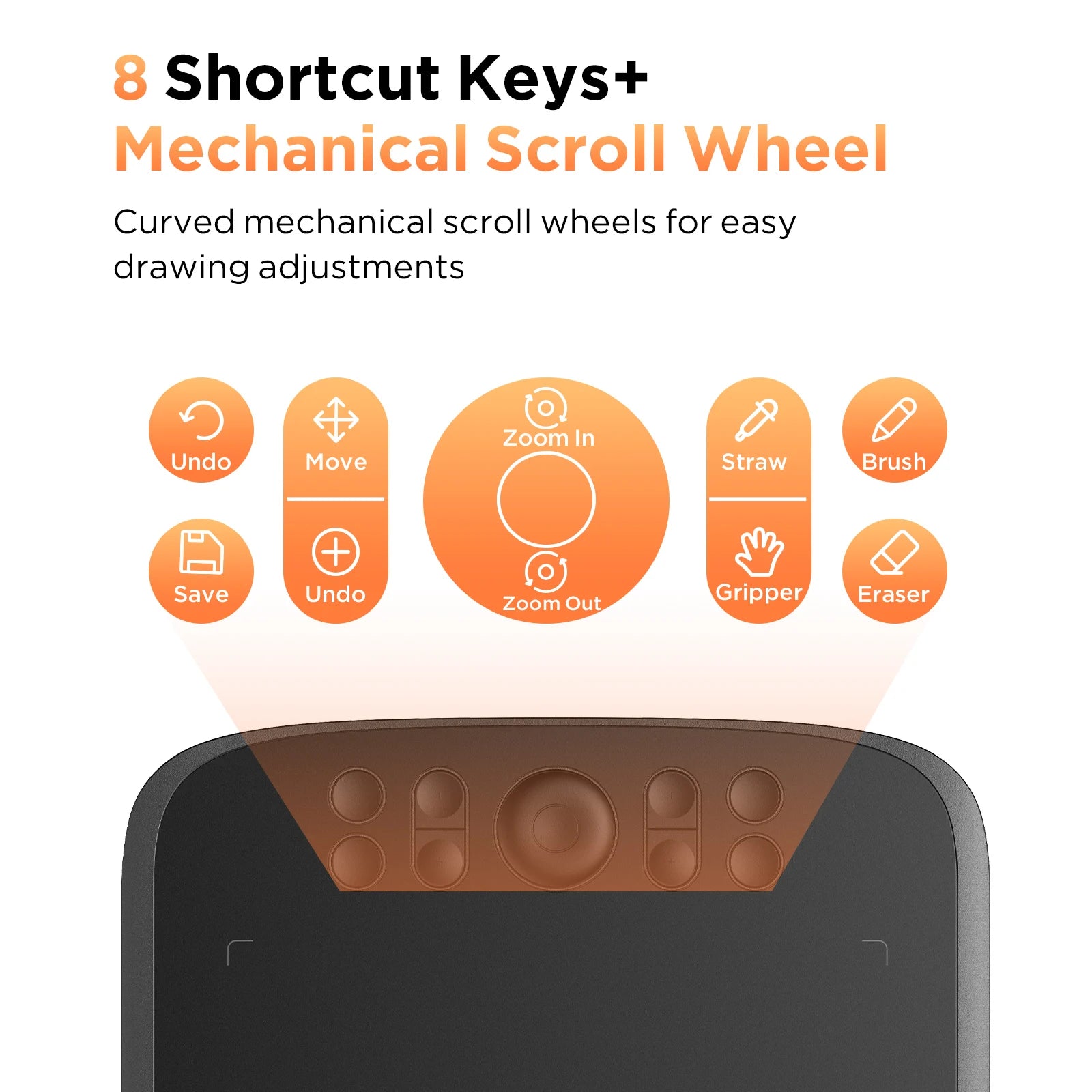The graphic tablet comes with a scroll wheel for adjusting canvas size by default. In addition, the drawing pad is equipped with 8 customizable shortcut keys. They are pre-set for accessing commonly used drawing tools such as pen, eraser, brush size, and undo. Both the scroll wheel and shortcut keys can be customized to your preference.