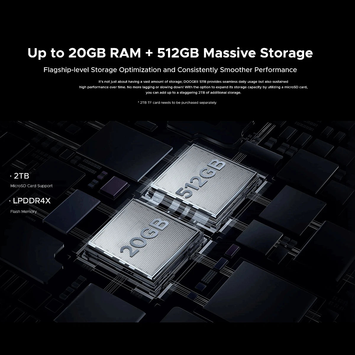 DOOGEE S118 offers ample RAM of up to 20GB and 512GB ROM for users to effortlessly switch between social media platforms, email clients, video playback, and other apps without experiencing slowdowns.Gaming Space