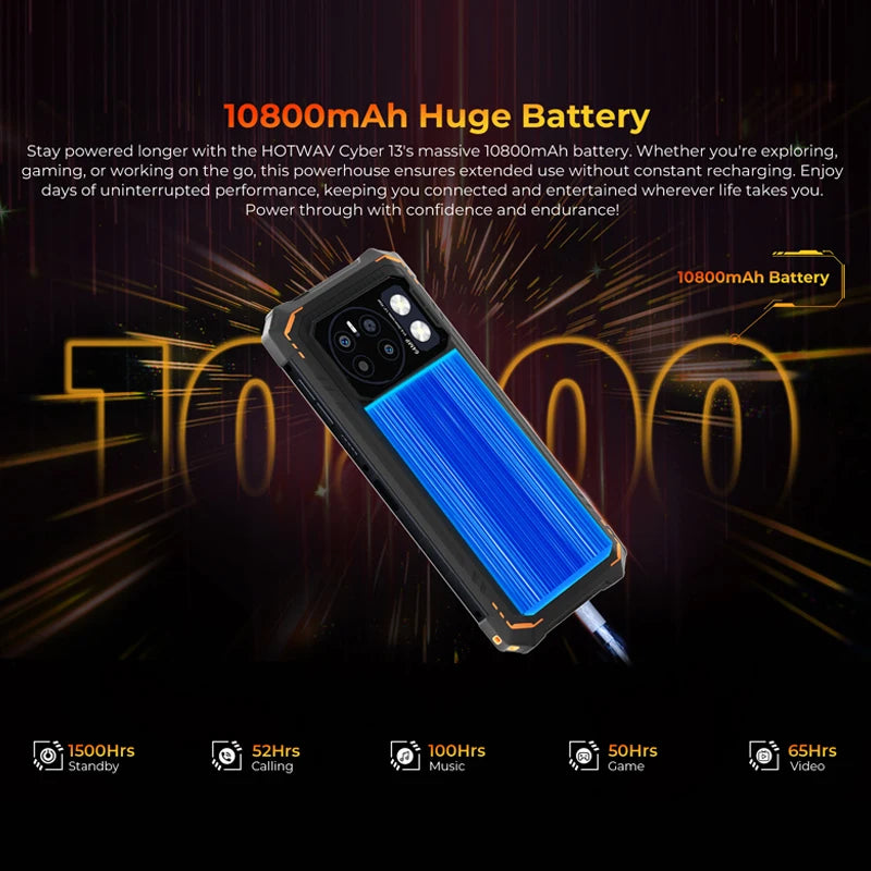 Stay powered longer with the HOTWAV Cyber 13's massive 10800mAh battery. Whether you're exploring, gaming, or working on the go, this powerhouse ensures extended use without constant recharging. Enjoy days of uninterrupted performance, keeping you connected and entertained wherever life takes you. Power through with confidence and endurance!