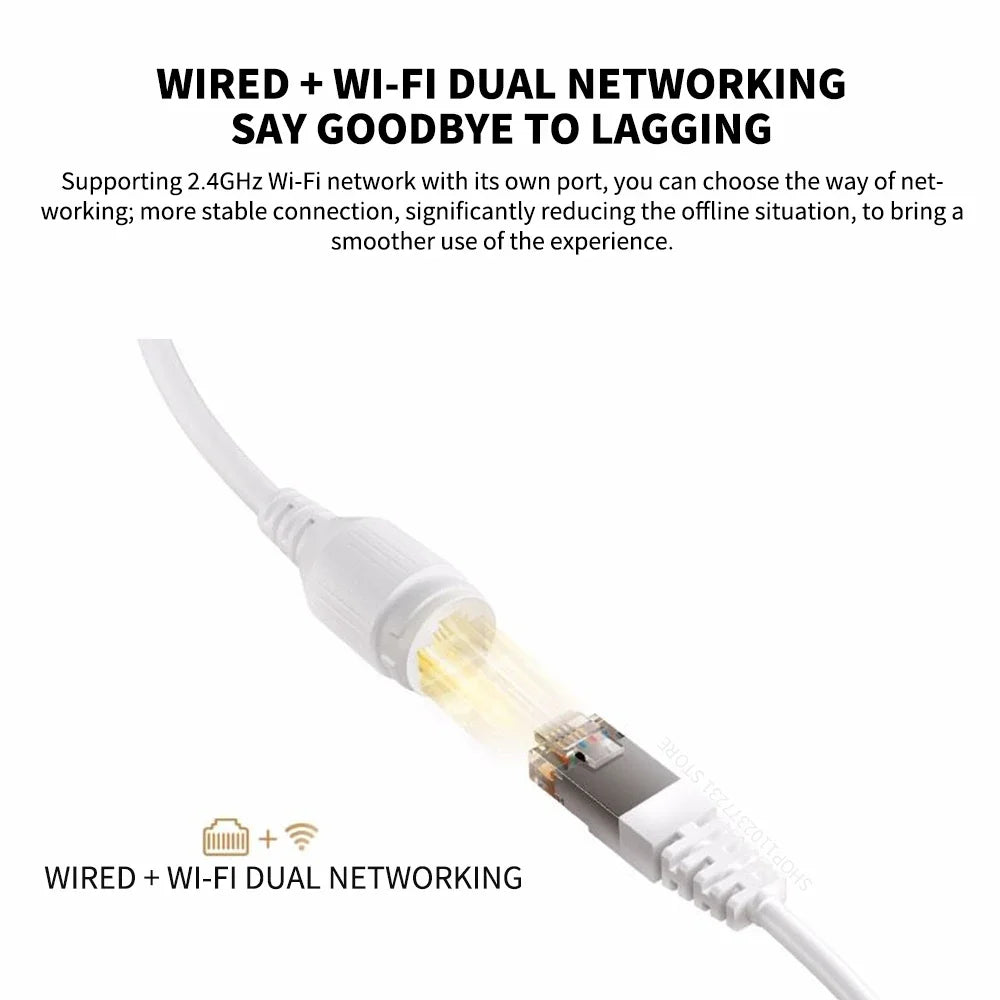-Built-in high sensitivity microphone, high-quality high-power speaker, with Al intelligent noise reduction algorithm. The sound pickup distance is long and the voice is loud, even in the complex outdoor environment, the sound effect is still clear.Supporting 2.4GHz Wi-Fi network with its own port, you can choose the way of networking; more stable connection, significantly reducing the offline situation, to bring a smoother use of the experience.