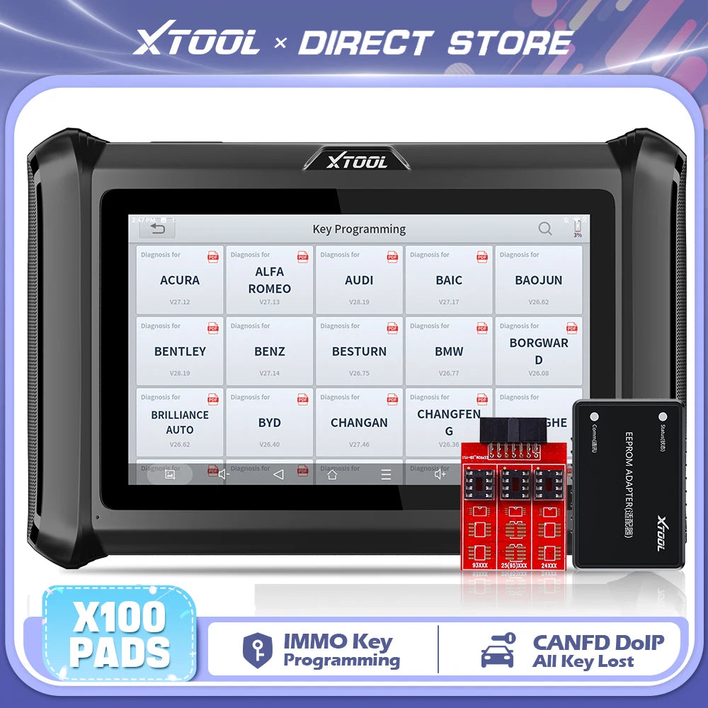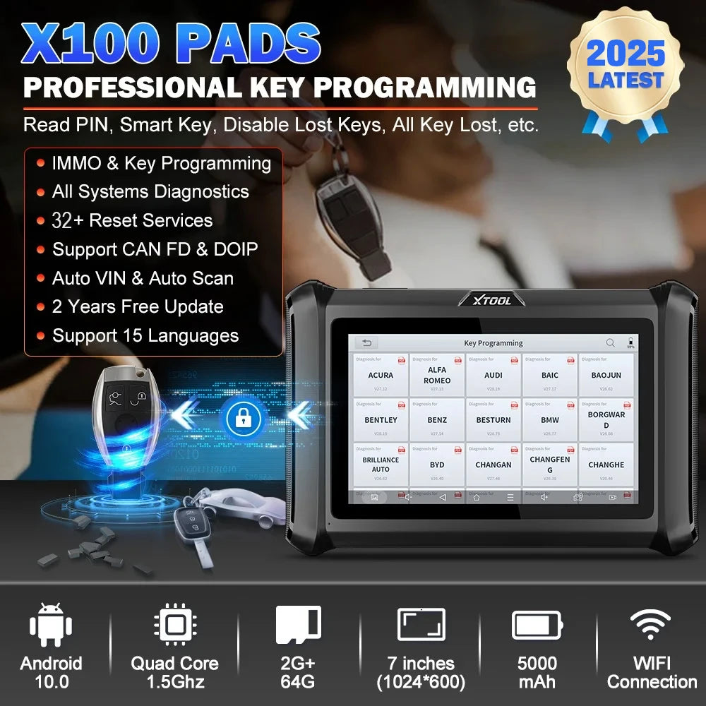 XTOOL X100PADS is an advanced tablet scan tool based on the Android 10.0 operating system, X100PADS is a tablet with the latest technologies to perform key programming and Diagnostic, 32+ Resets, injector coding, Instrument cluster, oil service light reset, timing belt service light reset, tire pressure warning light reset, EPB reset, throttle body reset, DPF reset, battery reset, steering angle calibration Full Systems Diagnosis, 10 full obd2 functions, 7-inch screen with 1024*600 resolution, supports CAN FD and DOIP protocols, support 10,000 cars for benz, for audi, for vw, for bwm, etc. wifi one-click update, two years free update and 5-year warranty